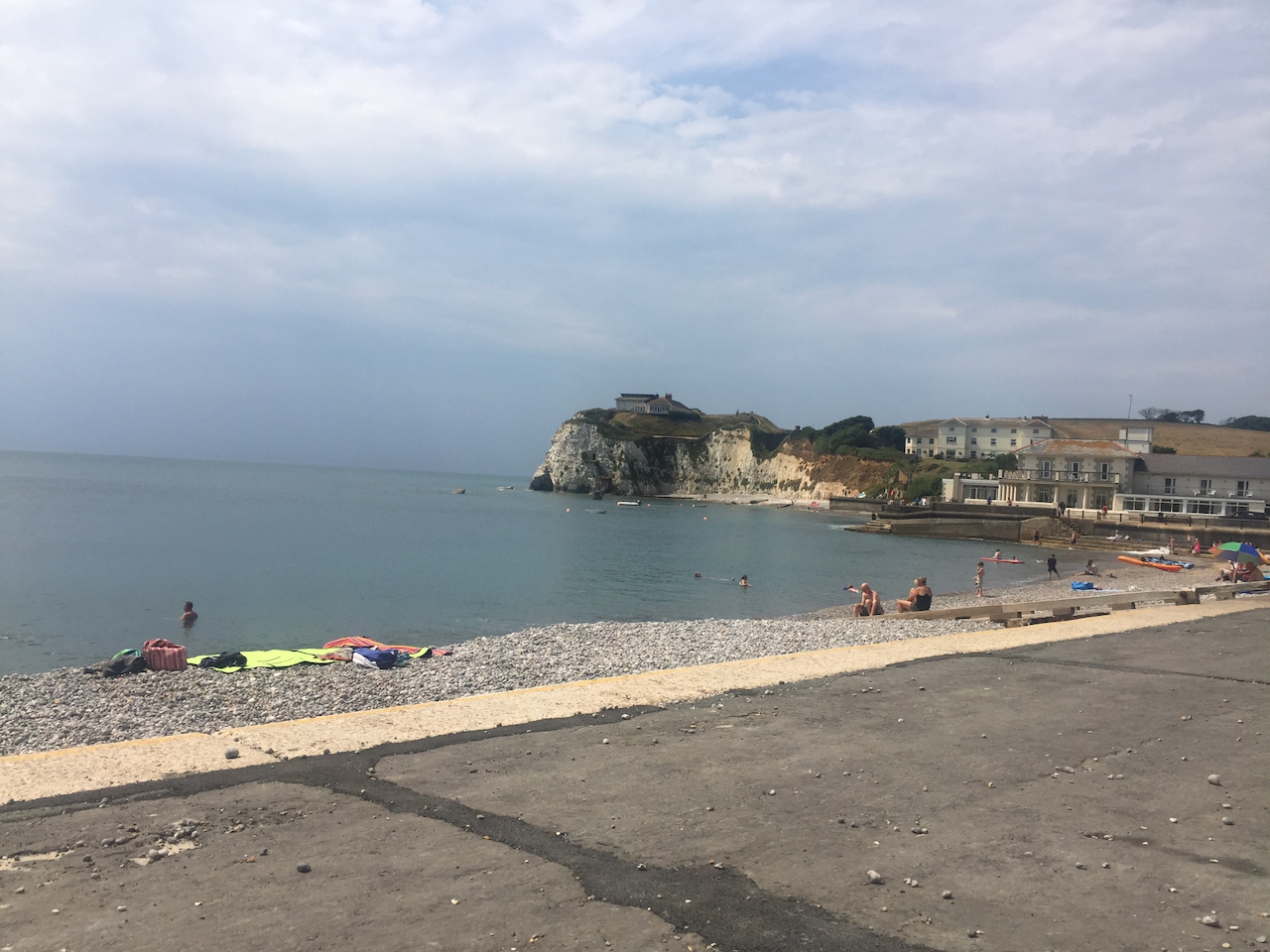 Strange grey mist that looked like rain over the sea and mainland, approaching inland. We stopped by Freshwater Bay, seeing divers and then home. Emma and I went to the beach at 7.00pm for me to have an evening swim. I was sure the dense grey cloud would come inland causing it to rain but it stayed on the horizon, the sun popping up to give me a hazy sunny swim. The water was dead calm and warm. I managed three lengths between breakwaters. Emma and I were concerned that we had settled near a blue towel, T-shirt and shoes, but could not see anyone swimming. As I got dressed we saw a swimmer in the distance. It turned out he had been to Totland Bay, about a 45 minute swim, depending on the tide!