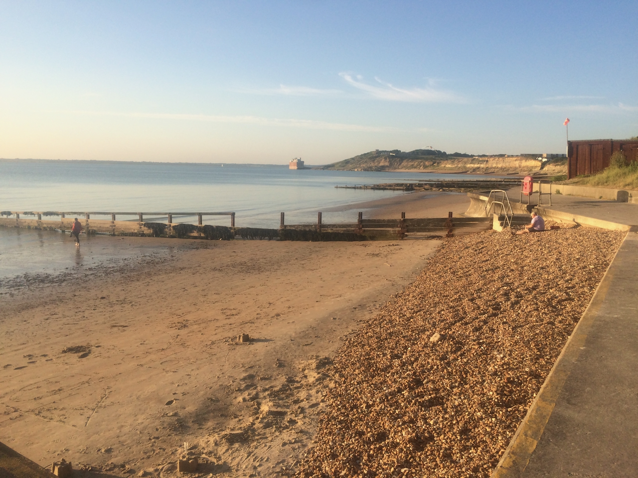 Weather overcast, although still really warm when taking in the morning. Nick again cycled to Yarmouth down the estuary. I was contemplating doing the same at my own pace, but then noticed that I had lost my expensive silver water bottle, realising I had left it on the beach when changing into a warm top – Bum! Immediately cycled down to see if, by any chance it was still there. Fruitless, although bit was already 10:00 – not telling the girls. Nick joined me, buzzing around impatient for his ride. No water bottle but I swam incidentally. Met a woman who had just been in, so despite it starting to rain, thought I could at least say I had swum in the rain and thought I might prefer this to cycling in the rain. It proved to be a shower that was gone by the time I had got into my swimsuit and the sky seem cleared offering hazy sunshine for a very pleasant swim in glassy waters. Just did two lengths between breakwaters, walked down to view the Hut restaurant where I saw you could pay up to £120.00 for a special cooked lobster, possibly for two.