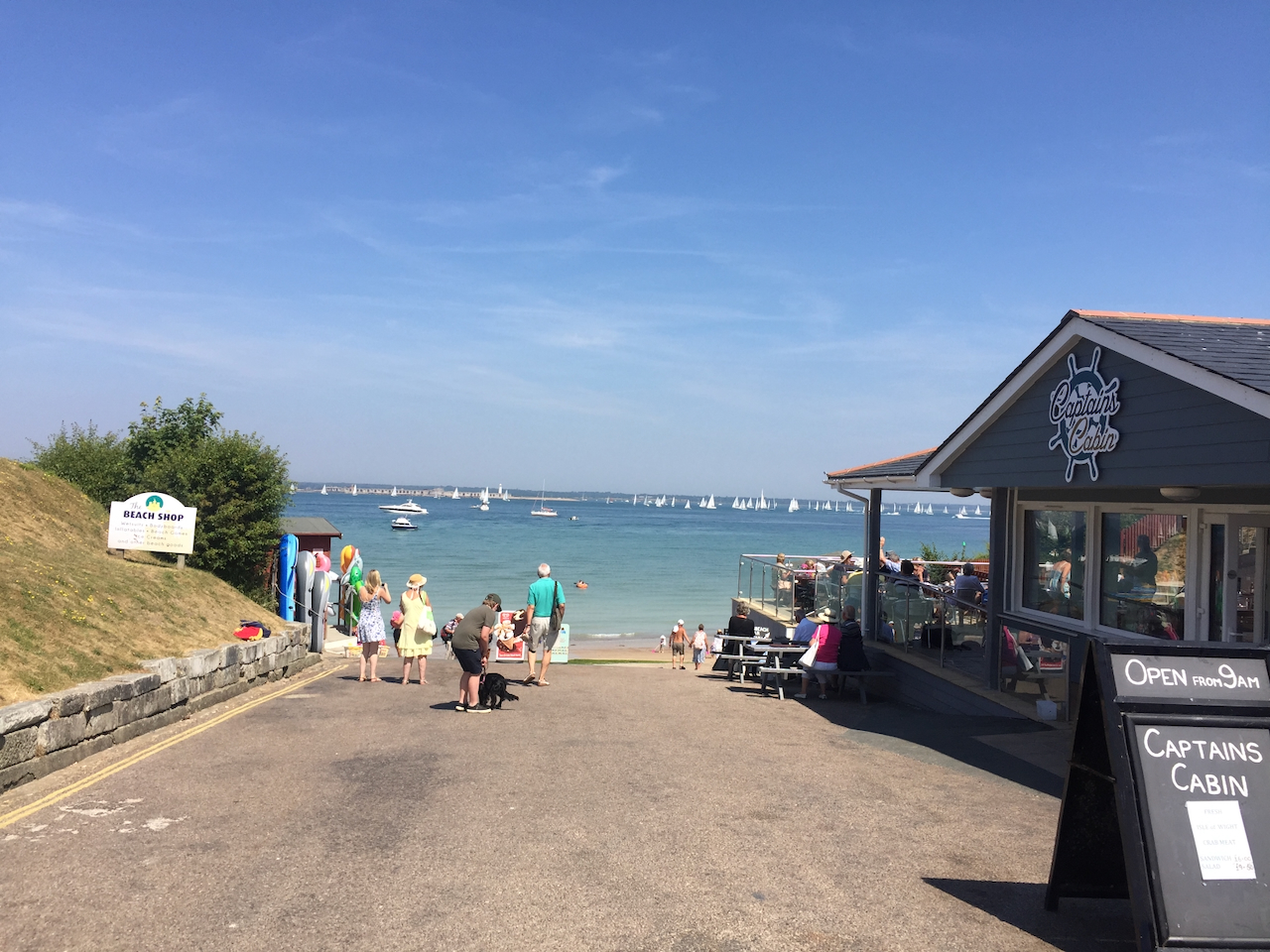 Woke to a beautifully sunny day, the temperature estimated to max at 26c and no wind! Emma and I went for an early morning swim ….actually going out at 10.30. The tide was out, the sea calm and the water beautifully clear again in a way that I have not seen in England before. Emma and I swimming together, although she spent some of that swim walking, not sure why. We chatted together then I went for second glorious swim. We stayed until nearly 12.30, returning so that we could go out to Ventnor and find the Crab Shed, a crab café somewhere on the beach front. As they only serve from 12:00 to 3:00 we agreed to try to go out at around one to one thirty. Got back shortly before Nick, had a quick shower and we all travelled the half hour there, taking the senic route across the plane, huge flat fields. Ventnor by contrast seemed to be built on steep hillside.